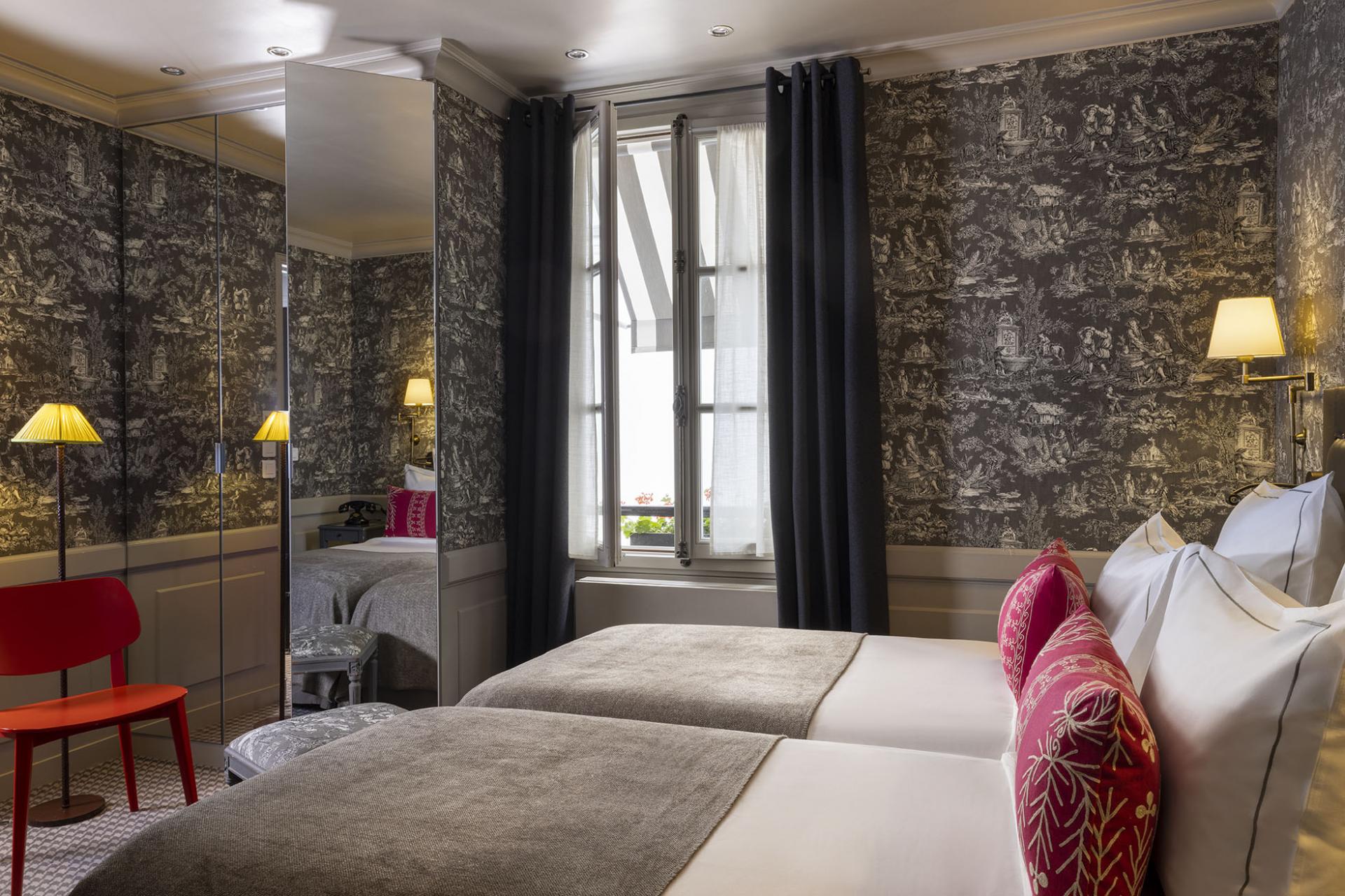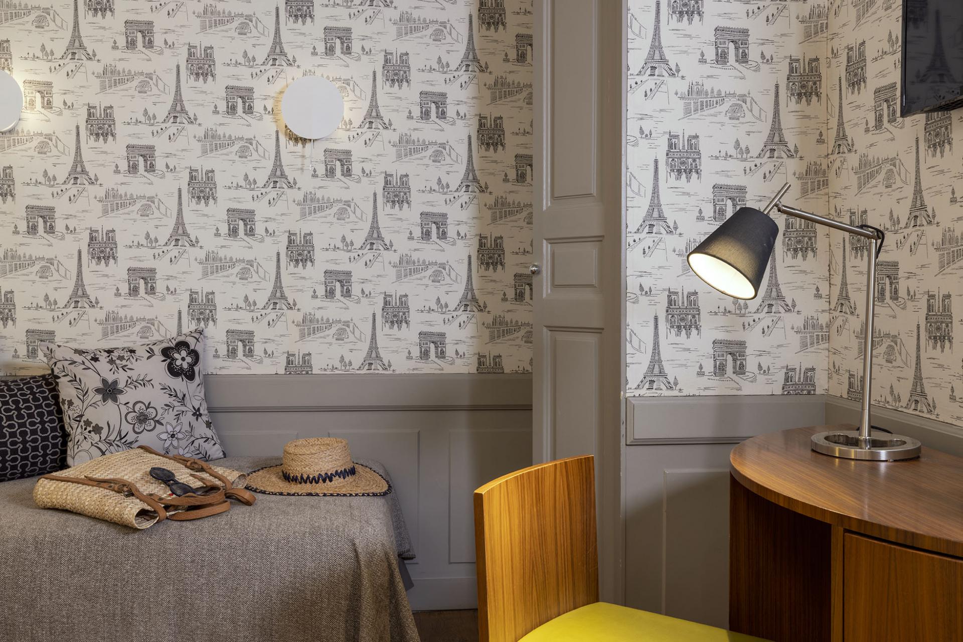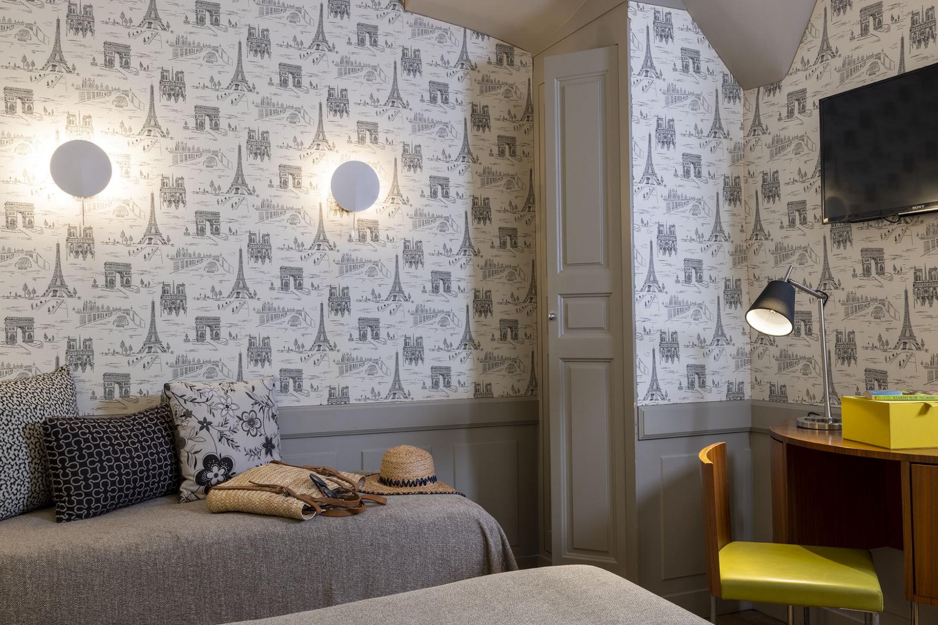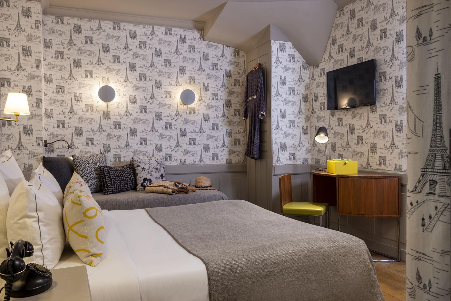 La habitación más parisina de Jacques PREVERT, vestida con una tela de pared que cubre nuestros monumentos principales y cubierta con parquet de roble marrón, ubicada en la planta baja, esta habitación ideal para tres personas está equipada con 3 camas, '' un baño con ducha de alta gama, cómodas camas tamaño queen, pantalla plana con canales internacionales, radio FM, caja fuerte, minibar (no abastecido), aire acondicionado, un toque de Provenza y de "Hecho en Francia" con los productos de bienvenida de L'Occitane.