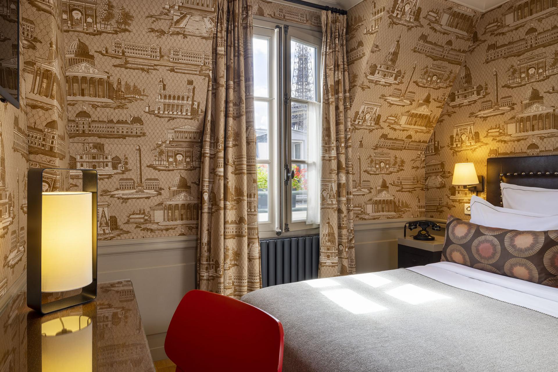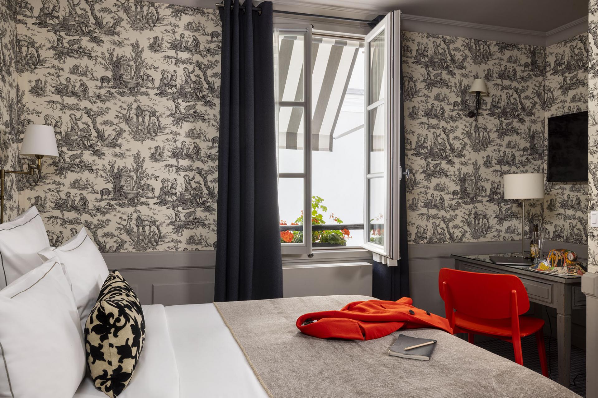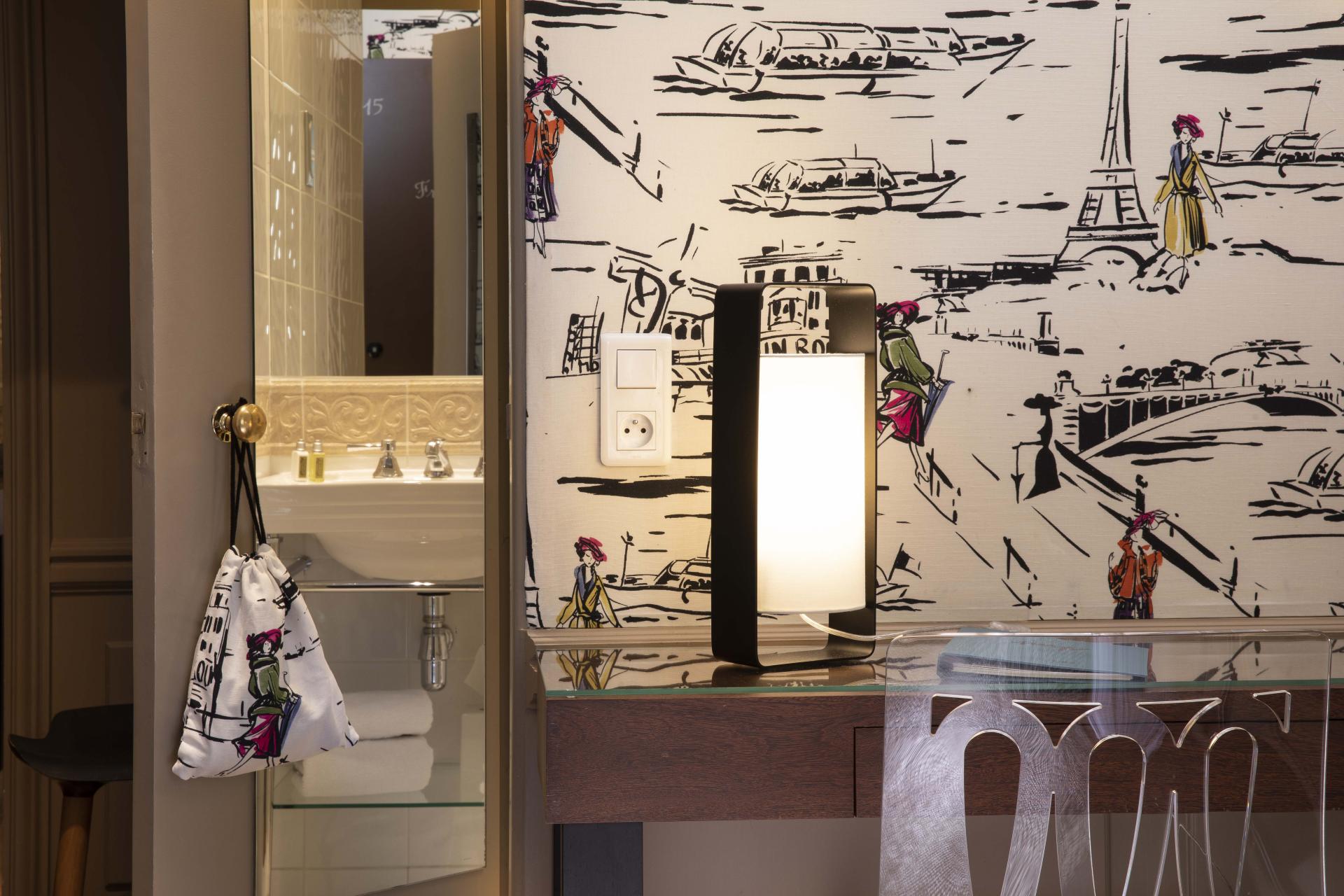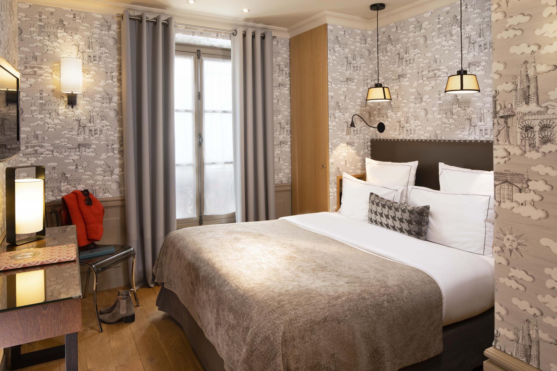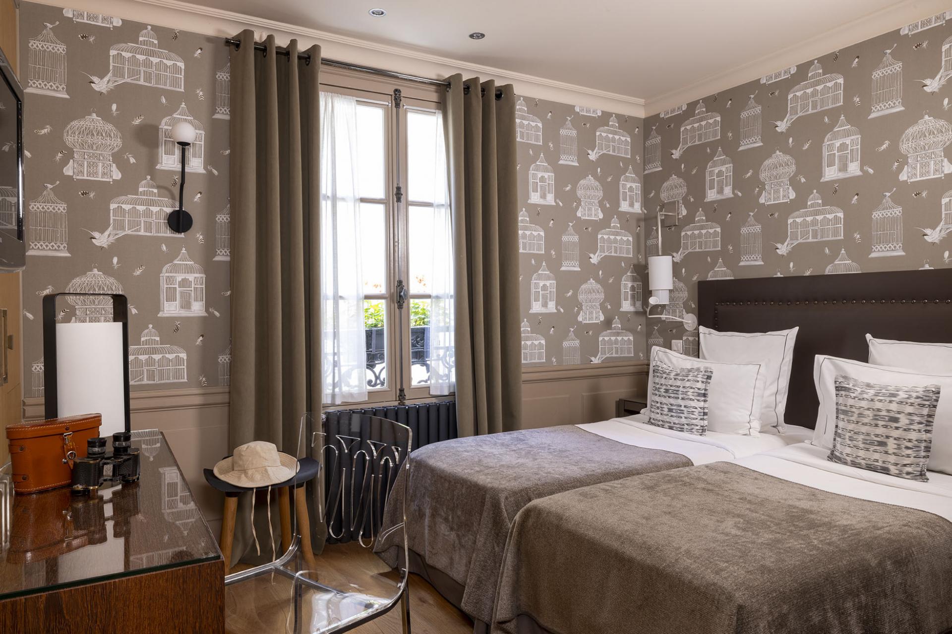 La habitación más parisina de Jacques PREVERT, vestida con una tela de pared que cubre nuestros monumentos principales y cubierta con parquet de roble marrón, ubicada en la planta baja, esta habitación ideal para tres personas está equipada con 3 camas, '' un baño con ducha de alta gama, cómodas camas tamaño queen, pantalla plana con canales internacionales, radio FM, caja fuerte, minibar (no abastecido), aire acondicionado, un toque de Provenza y de "Hecho en Francia" con los productos de bienvenida de L'Occitane.