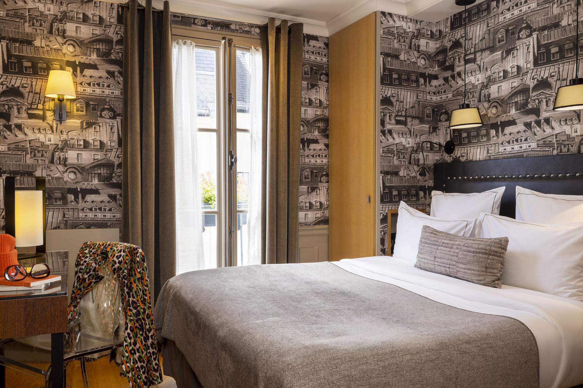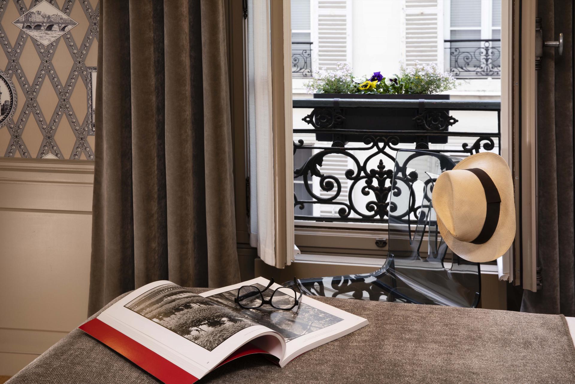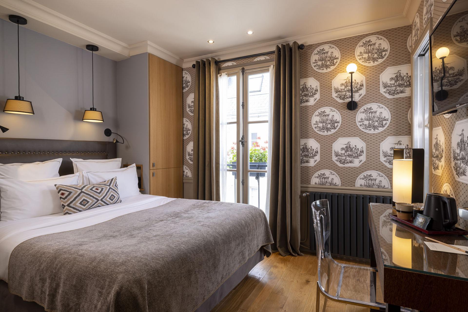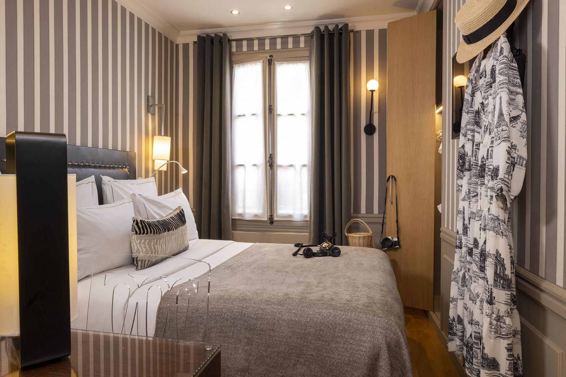 La acogedora habitación de los poetas, es la habitación más pequeña del hotel, con vistas a nuestro patio típicamente parisino, apreciará su calma y la optimización del espacio.